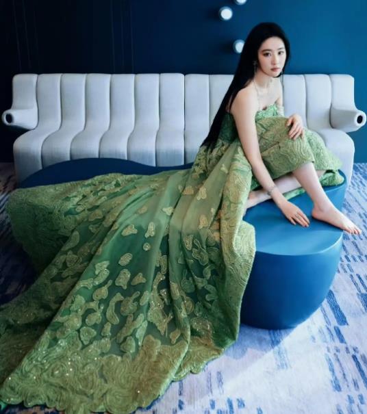 绿色看着就让人觉得生机勃勃,还能衬得皮肤更白。这条长裙腰部收紧,裙摆逐渐变大,显得身材比例特别好。为了防止走光,腰部到大腿中间还点缀了绿色花纹,既美观又高级。大腿以下的部分是薄纱,让腿部线条若隐若现。刘亦菲身高170厘米,一双大长腿特别吸引人。